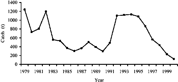 From 1972 to 1979, Kuwaiti landings of zobaidy averaged 715 tonnes/year, where as from 1982 to 1988, landings averaged only 300 tonnes/year (Fig. 1). This reduction was a result of the closing of fishing areas in northern Kuwaiti waters and in Iranian waters during the Iran-Iraq war. The catches increased to an average of over 1000 t/yr after 1991, when the restrictions on fishing grounds were lifted; however, these catches started to decline in 1996, dropping to 120 tonnes in 2001.