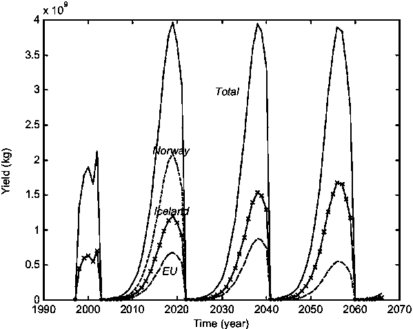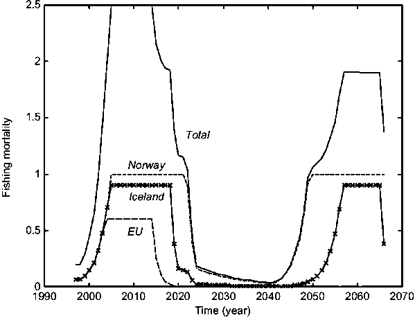 Based on the economic and biological parameters of the spring-spawning herring fishery, the simulation model predicts that harvesting will continue with ever-declining catch levels until the stock collapses. After the collapse, the population dynamics (Figure 1c) shows that about 20 years are required for the stock to enter a recovery phase. A complete stock recovery even to the average 1993-1996 levels is not possible because in the open access case a positive stock response immediately initiates harvesting and the cycle, albeit at a much lower amplitude, repeats. It is interesting that in the stock recovery phase only Norway and Iceland find it profitable to expend total fishing effort to harvest. The EU shows only moderate fishing effort and fishing mortality. In Figure 1d, net profitability mirrors closely the fortunes of catch levels increasing only during the initial phase of harvesting and, thereafter, declining continuously until the stock is depleted and net profits fall to zero.