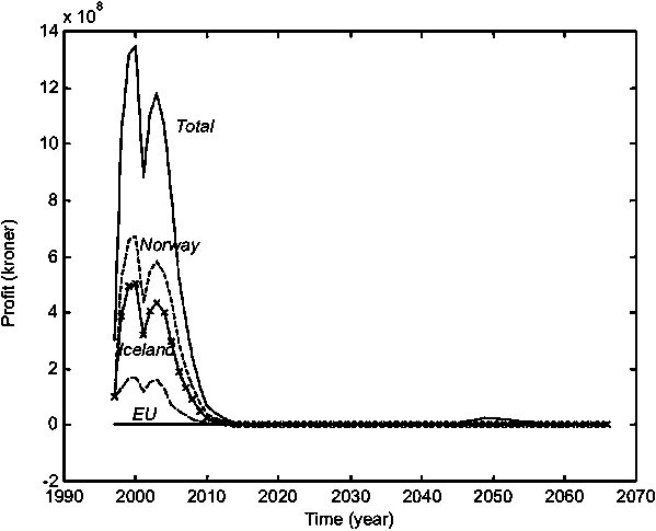 We address this question in Table 4 where net profit levels across the five alternative management strategies are listed. Keep in mind that nominal profit is discounted at 4 percent annually over a 70-year time horizon. First, comparing open access management to open access with fishery closure, all three agents are made better off in terms of higher net profits by engaging in co-operation and adhering to fishery closures. However, it is also clear that the benefits of co-operation are not equally shared across the different fleets. Norway sees an increase of 149 percent, Iceland an increase of 106 percent but the EU measures only an increase of 43 percent relative to open access. Both Norway and Iceland clearly benefit from co-operation in the fishery, whereas co-operation for the EU is somewhat less advantageous. Nonetheless, there is ample profits earned in the fishery between Norway and Iceland to offer side payments to make it worth while for the EU to adhere to fishery closure. The alternative would be a return to open access where both Norway and Iceland would be worse off.