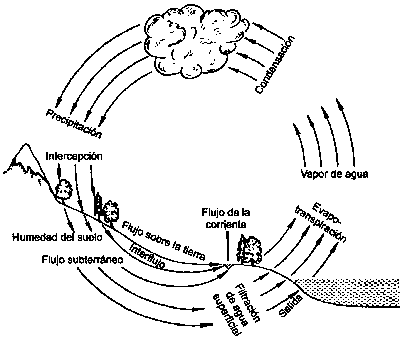 La comprensión del ciclo hidrológico es esencial para el manejo eficiente del agua de lluvia y del agua del suelo. El agua ocurre no solo en forma líquida sino también en forma sólida -granizo, nieve- y en forma gaseosa -vapor de agua. La cantidad de agua en el mundo es constante pero el agua está continuamente cambiando de una forma a otra y se mueve a diferentes velocidades. Estas interrelaciones se muestran en forma simplificada a escala regional en la Figura 2.