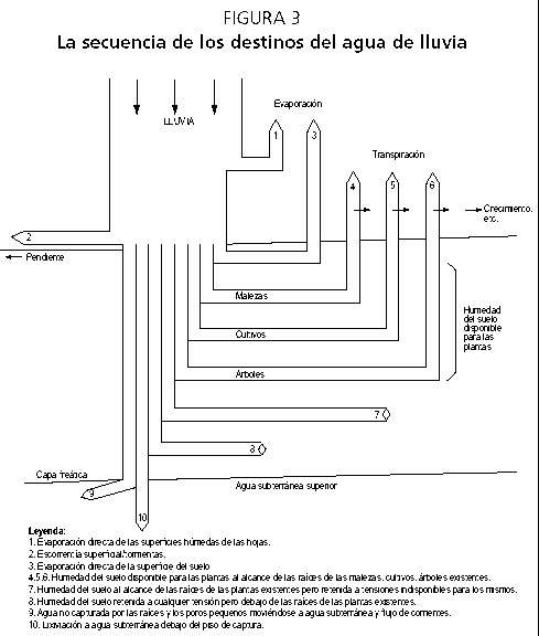 Leyenda: 1. Evaporación directa de las superficies húmedas de las hojas. 2. Escorrentía superficial/tormentas. 3. Evaporación directa de la superficie del suelo 4,5,6. Humedad del suelo disponible para las plantas al alcance de las raíces de las malezas, cultivos, árboles existentes. 7. Humedad del suelo al alcance de las raíces de las plantas existentes pero retenida a tensiones indisponibles para los mismos. 8. Humedad del suelo retenida a cualquier tensión pero debajo de las raíces de las plantas existentes. 9. Agua no capturada por las raíces y los poros pequeños moviéndose a agua subterránea y flujo de corrientes. 10. Lixiviación a agua subterránea debajo del piso de captura. |