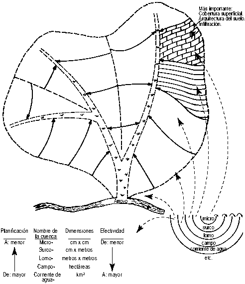 Con el objetivo de permitir que el agua de lluvia sea embebida en el suelo y controle la tasa del flujo y cualquier exceso de escorrentía, es posible subdividir una microcuenca en una jerarquía más detallada de Microcuencas en las cuales las subdivisiones menores pueden ser medidas en centímetros cuadrados, las mayores en hectáreas y todas ellas dentro de Microcuencas de kilómetros cuadrados. La entrada del agua de lluvia en el suelo depende del grado de porosidad mientras que el manejo de la escorrentía y de la erosión a través de la superficie también depende de las obras físicas que puedan ser construidas cuando las lluvias exceden las mejores tasas de infiltración (Figura 5).