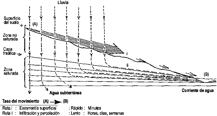 Las aguas de las inundaciones corren hacia los ríos y arroyos que aumentan su nivel rápidamente después de fuertes lluvias. Esas aguas derivan en su mayoría del flujo de agua sobre la tierra y el flujo de las inundaciones es por lo general barroso ya que contienen materiales erosionados. Las aguas de corrientes limpias se originan en el agua de lluvia que se ha infiltrado en el suelo y ha percolado a través de poros de distintos tamaños a velocidades diferentes y más lentas (Figura 7).