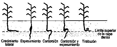 El indicador más claro de un enraizamiento restringido de las plantas es la distribución de las raíces del mismo. Cuando las raíces están físicamente restringidas por una capa densa que contiene pocos poros adecuados para su penetración a menudo desarrollan formas de crecimiento características por encima de la capa dura como se indica en la Figura 9. La forma más común es un cambio abrupto en la dirección de crecimiento, de vertical a horizontal, y un espesamiento de las raíces que buscan penetrar la capa restrictiva por encima del límite superior de esa capa.
