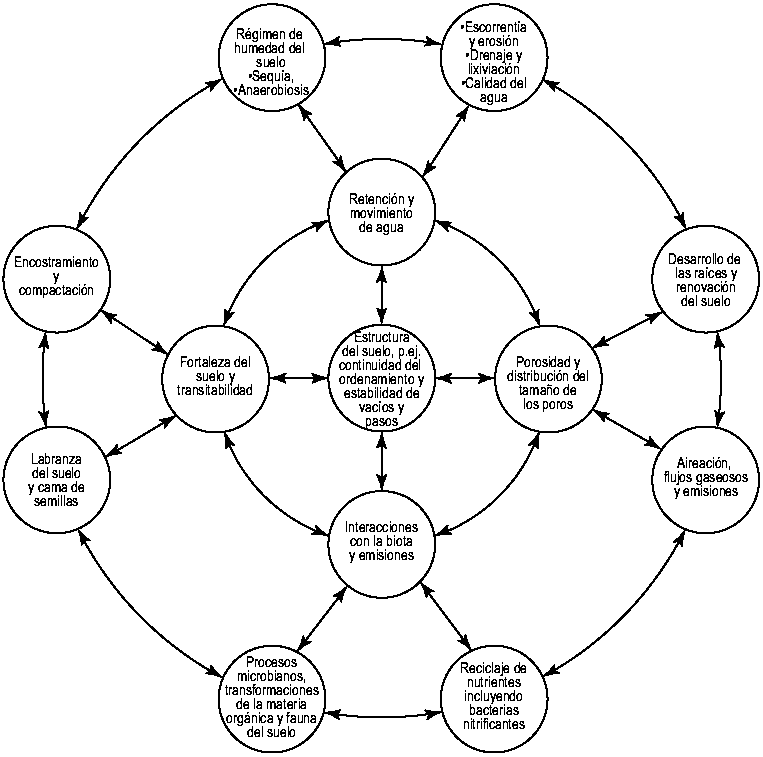 Las proporciones relativas de sólidos, líquidos y gases en el ambiente radical son tan importantes como la forma en que están ordenados. En este aspecto, el contenido biótico del suelo también es importante, porque junto con las raíces de las plantas contribuye a su reestructuración y a mejorar su porosidad después del daño de la compactación, pulverización y colapso estructural.