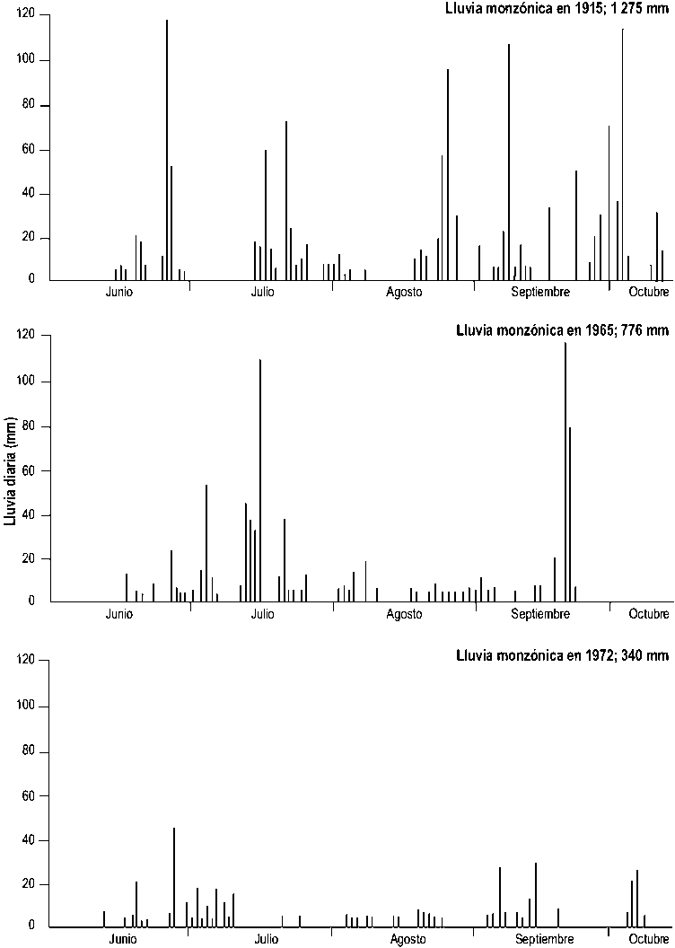 La inseguridad de las lluvias dentro de la estación húmeda puede ser apreciada gráficamente (FAO, 1999a). La Figura 13 muestra un ejemplo de sequías de corta duración dentro de la estación de los monzones en Hyderabad, India, con serias consecuencias para los cultivos anuales.