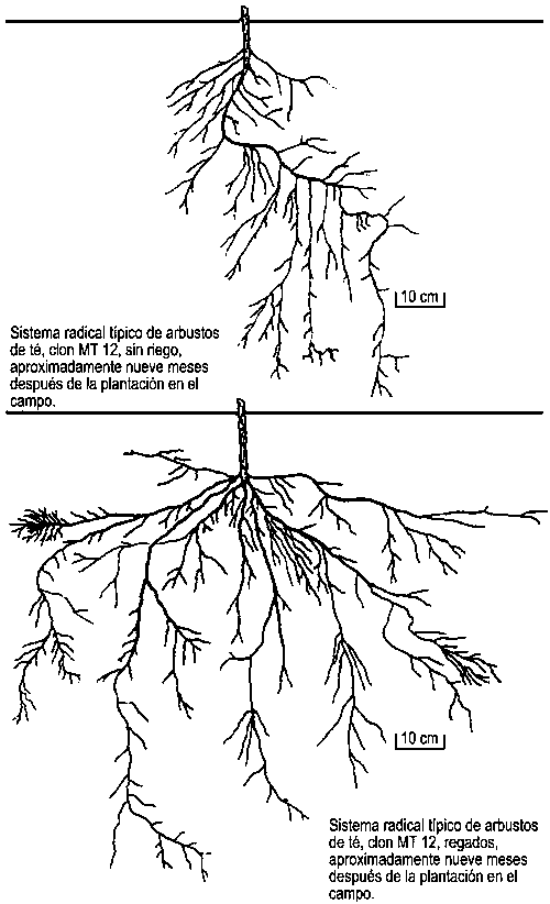 En las regiones con estaciones secas la atención se debería enfocar en cuanta agua de lluvia puede ser capturada y almacenada en el suelo en lugar de enfatizar cuanta escorrentía ha ocurrido en la superficie. Los sistemas radicales son más extensos cuando el agua no es un factor limitante, tal como ilustran las diferencias en el crecimiento de las raíces de plantas de té del mismo clon cultivadas en condiciones de secano o bajo riego (Figura 14). Después de nueve meses los sistemas radicales de una planta de cada uno de los tratamientos fueron lavados y dibujados a escala sobre papel. Los períodos secos durante la estación lluviosa de 1968-69 condujeron a la inhibición del crecimiento de las raíces en el tratamiento de secano mientras que la provisión regular de agua de riego en el otro tratamiento evitó el estrés hídrico y originó un profuso sistema radicular. Las raíces crecieron y se extendieron dentro de los volúmenes de suelo en los que había humedad disponible.