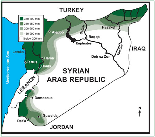 Although generally dry, the Syrian Arab Republic is a country that encompasses a great diversity of agro-ecological conditions and rural production systems. The main factors determining the agro-ecological diversity are climate, landforms and geological parent materials. The Syrian Arab Republic is located at the tip of the Fertile Crescent and lies entirely within the range of a major precipitation gradient, varying from about 1 500 mm in the west of the country to less than 100 mm in the southeast.