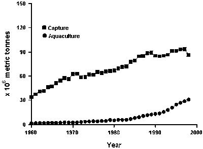 World fish production (catches of wild fish plus production in aquaculture) has increased steadily to approximately 120 million tonnes in recent years (Figure 2.1) (FAO, 2000). Declines in captured fish were seen in 1998 (Figure 2.2), mainly due to decreased catches of small pelagic fish in Chile and Peru, caused by the "El Niño". This decline affected mainly fish meal production, while food fish production stayed the same. In 1999 and 2000 fish production recovered and returned to pre-El Niño level. China is the top producer with some 41.6 million tonnes in 2000. Peru was the second major fishing nation with catches of 10.7 million tonnes. The importance of aquaculture continues to expand, especially for freshwater species such as carp, and almost one third of fish used for human consumption are now produced in aquaculture (FAO, 2000).
