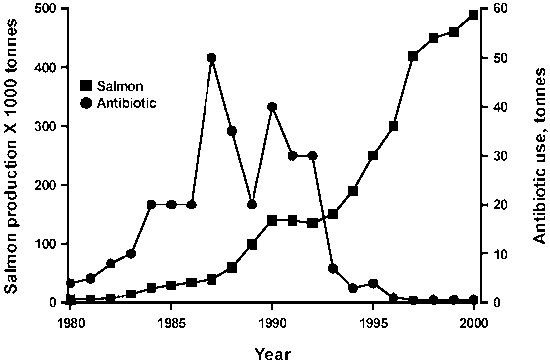 Antibiotics are used in aquaculture as prophylactics, as growth promoters and in the treatment of diseases. Prophylactic use of antibiotics is defined as the administration of antibiotics in advance of disease occurrence and this is a common practice in shrimp hatcheries in Asia to reduce the incidence of diseases (GESAMP, 1997). A recent review (Graslund and Bengtsson, 2001) report the widespread prophylactic use of antibiotics in both shrimp hatcheries and in shrimp ponds in Southeast Asia. Antibiotics are usually administered in aquatic feeds and most commercial shrimp feeds contain antibiotics (Flaherty et al., 2000). In contrast, antibiotics are not used either as prophylactic agents or as growth promoters in temperate water aquaculture production in Europe and North America (Alderman and Hastings, 1998). In recent years the use of antibiotics has fallen dramatically in the farmed salmon industry in Norway form about 50 tonnes to less than one tonne annually (Figure 5.17). This is largely as a result of the successful development and use of vaccines against the principle fish pathogens (Alderman and Hastings, 1998).