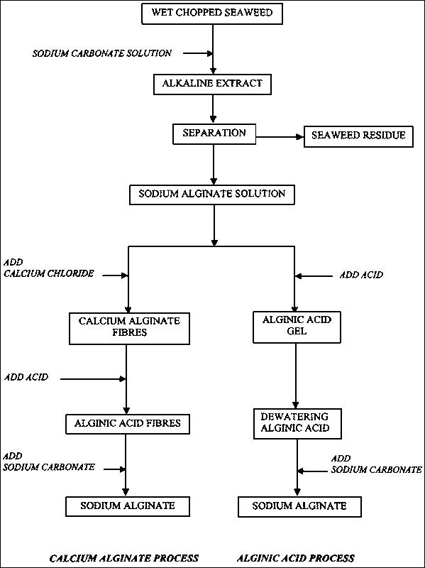The process appears to be straightforward, certainly the chemistry is simple: convert the insoluble alginate salts in the seaweed into soluble sodium alginate; precipitate either alginic acid or calcium alginate from the extract solution of sodium alginate; convert either of these back to sodium alginate, this time in a mixture of alcohol and water, in which the sodium salt does not dissolve.