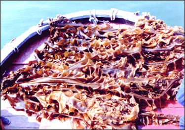 Haidai is the Chinese name for Laminaria japonica, a seaweed that was introduced to China accidentally from Japan in the late 1920s. Previously, China had imported all requirements from Japan and the Republic of Korea. It is now cultivated on a large scale in China. It is a large seaweed, usually 2-5 m long, but it can grow up to 10 m in favourable conditions (Figure 51). It requires water temperatures below 20°C. Laminaria japonica grows naturally in the Republic of Korea and is also cultivated, but on a much smaller scale; the demand is lower because Koreans prefer wakame (Undaria pinnatifida).