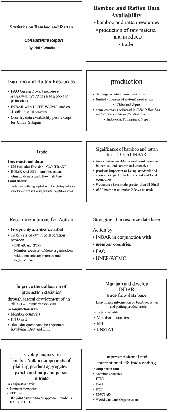 This review of the statistics on bamboo and rattan has identified the following priorities for future development of international data on resources, production and trade: