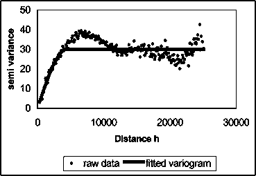 The plot of the semi variance as a function of distance from a point is referred to as a semi variogramme (Figure C.2). The semi variance increases as the distance increases until it reaches a maximum at a certain distant away from a point. Then the semi variance will equal the variance around the average value, and will therefore no longer increase, causing a flat region to occur on the semi variogram, which is called the sill.