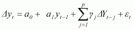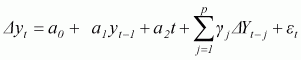 The differences among the above regression equations depend on the presence of a0, constant (drift) and a2t, deterministic term (time trend), all of which are called nuisance parameters. Test results can be based on OLS estimations. The above equations represent the first order autoregressive process (a process depending only on one lag value). The test can be extended for higher order autoregressive processes. The extended DF test for higher order equations is known as the ADF test. Considering a pth order autoregressive process, Equations A.4 to A.6 can be extended as: