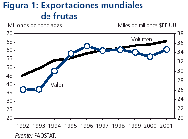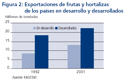 Las frutas y hortalizas son importantes productos básicos para los países en desarrollo que desean diversificar sus exportaciones. El comercio mundial ha crecido notablemente en todas las categorías (Figura 1). El valor de las exportaciones de los países en desarrollo aumentó en 4 500 millones de dólares EE.UU. de 1992 a 2001, esto es, un crecimiento del 55 por ciento (véase la Figura 2), del 31 al 37 por ciento del total de las exportaciones mundiales. En 2001, el valor de las exportaciones mundiales de frutas y hortalizas fue de 34 600 millones de dólares EE.UU. Casi el 60 por ciento de esa cifra correspondía a las exportaciones de frutas y un poco más del 40 por ciento a las de hortalizas. Las principales frutas comerciadas fueron los cítricos (21 por ciento), las bananas (19 por ciento), las uvas y las manzanas. El valor del comercio de frutas tropicales (mangos, papayas, piñas tropicales y otras) es ligeramente inferior a los 1 000 millones de dólares EE.UU. (5 por ciento). Las hortalizas más comerciadas son los tomates y las cebollas.