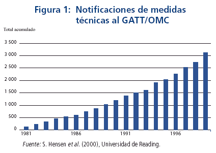 El comercio internacional ha crecido de forma espectacular durante los últimos 30 años, lo que ha contribuido a un aumento del producto interno bruto (PIB), incluso en los países en desarrollo. Los acuerdos MSF y OTC de la OMC establecen los criterios para distinguir los obstáculos al comercio justificados de los injustificados. La proliferación de MNA en los últimos 20 años, particularmente en los países desarrollados, y la aplicación de distintas normas por los distintos socios comerciales han provocado un aumento del número de notificaciones de medidas técnicas al GATT/OMC (véanse las Figuras 1 y 2).
