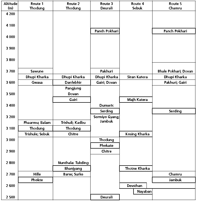 The 60 herds use different grazing lands, moving by five distinct routes through the year. The stopover points of each herd are fixed. Herds following Route 1 have three stopovers, Routes 2 & 4 have four stopovers, while Routes 3 & 5 have five stopovers. Almost all herds spend 4-6 months in winter at low altitude, i.e. 2 600-2 800 m, and 2-4 months on transitional camping points at 2 900-3.200 m while going up in March-June and descending in September-October. The summer grazing season at 3 300-4 000 m is short, only 1-3 months in June-August (Figure 16.2). The 56 herders had a total of 1 279 chauris, 57 local breeding bulls and 78 goats. All the chauris were in milk and not a single sheep was kept, in contrast to the herd composition in Sailung, where sheep and fowls were kept, along with the chauris. Non-productive chauris were traded over the Tibetan border. On average, there were 22 chauris, 1 bull and 1.3 goats per herd.