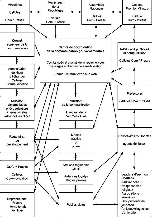 Lune des clefs de coûte de la politique de la communication gouvernementale consistera à faire connaître, à travers les méthodes les plus compréhensibles par tous, les rouages, le fonctionnement et les formes dintervention des différentes structures de lEtat, pour que les habitants des villes et de la campagne puissent bénéficier des retombées dun service public des plus efficients. Vérifié de visu sur le terrain, le système actuel de linformation ne peut permettre à la masse de prendre conscience de la gravité de la situation dextrême pauvreté qui caractérise le Niger.