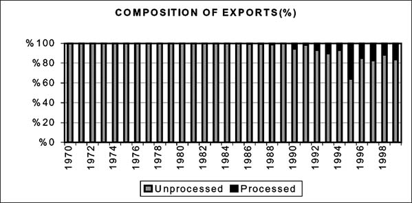 Tobacco yields, which ranged around 500 kg/ha in the early 1970s, increased to over 800 kg/ha in the mid-1970s and subsequently to between 800 and 1 000 kg/ha, averaging over 900 kg/ha (Figure 6.2).