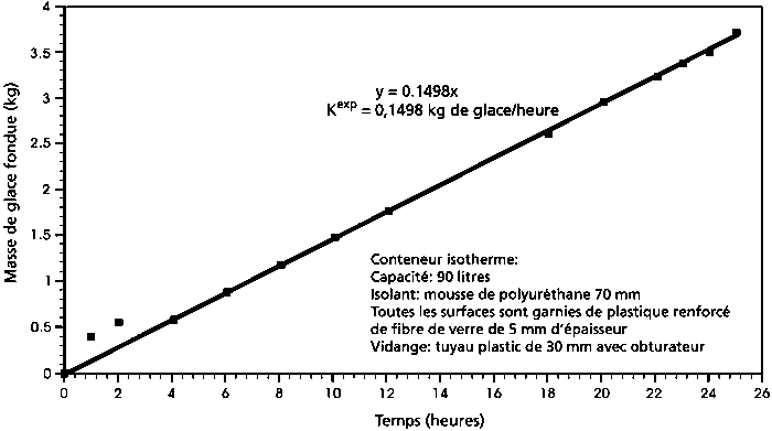 Les méthodes mathématiques et numériques permettent de calculer le taux de fusion de la glace dans les conteneurs à partir du coefficient de conduction (U), de la surface à travers laquelle s'opère le transfert thermique (A) et de la chaleur latente de fusion de la glace (L), qui est de 80 kcal/kg pour l'eau douce et de 77,8 kcal/kg pour l'eau de mer. Pour calculer le taux de fusion de la glace dans un conteneur donné (K1), exprimé en kilos de glace/h °C, on applique l'équation suivante: