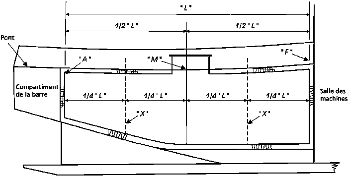 Trois sections, le maître bau «M» est situé à mi-chemin entre les cloisons «F» et «A». b)