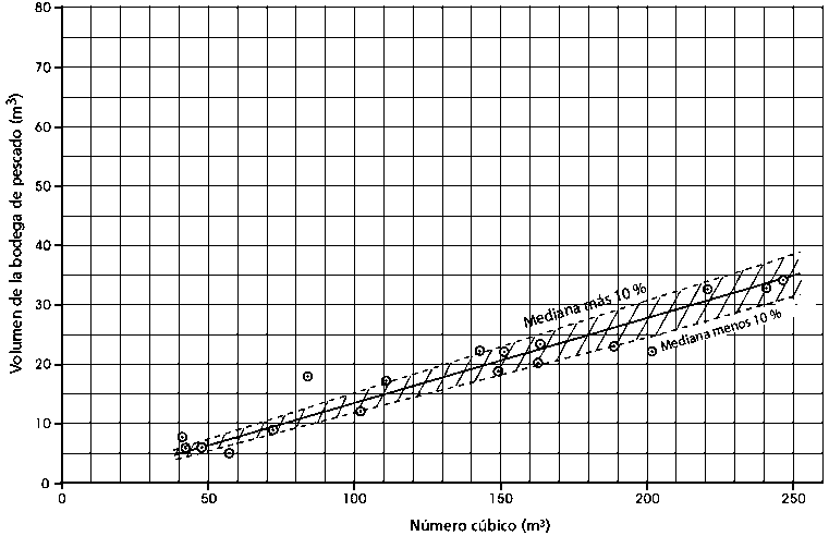 Según se observa en la Figure 7.5, el volumen de la bodega de pescado es: CUNO × 0,14 ± 10 por ciento. Por ejemplo, si el CUNO fuera de 150 m3, el volumen de la bodega de pescado sería de unos 20 m3.