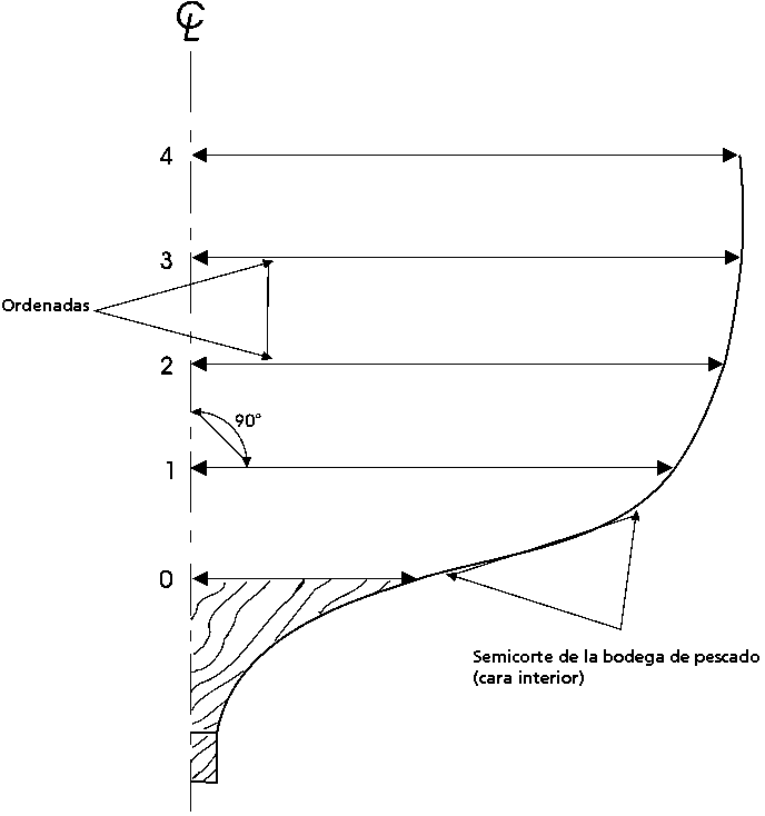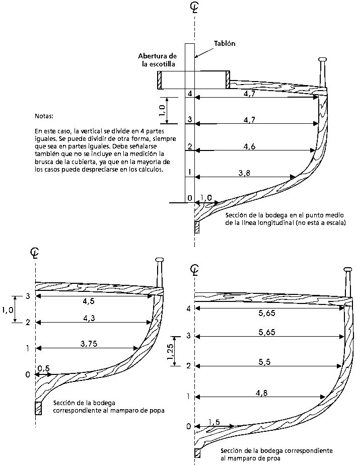 Quienes deseen calcular el volumen de una bodega de pescado mediante medición directa pueden hacerlo con relativa facilidad aplicando una fórmula sencilla a las mediciones realizadas. El método de medición seleccionado para este ejemplo es el conocido como «regla trapezoidal», que se utiliza por su relativa sencillez de aplicación en condiciones de campo y se considera suficientemente exacto para estos fines. Si el lector necesita una exactitud mayor, puede utilizar si lo desea las «reglas de Simpson» que son algo más precisas, aunque sólo en una proporción muy pequeña. No obstante, las reglas de Simpson requieren un número par de divisiones y algunos cálculos más, con el consiguiente riesgo de cometer errores inadvertidos.