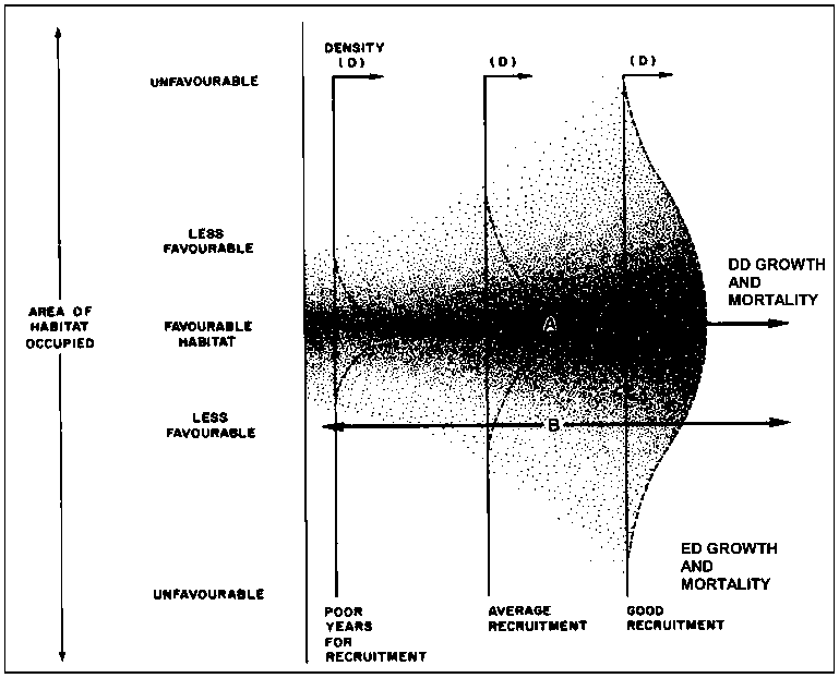 Figure 3.2 Variations in the spatio-temporal extent of recruitment and consequent stock contraction or expansion (from Caddy, 1989b). In "core" favourable habitats, density-dependent (DD) mechanisms prevail, lowering growth and mortality, whereas environmentally dependent (ED) mechanisms primarily regulate growth and mortality rates in unfavourable habitats during periods of good recruitment. The arrow marked A shows the time axis and the roughly constant density within source populations. The arrow marked B shows that sink populations may be absent from these peripheral areas in poor recruitment years.
