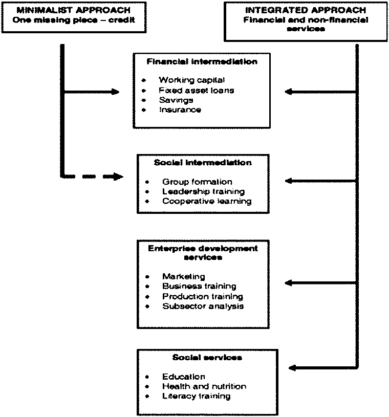 MFIs take on either one of two approaches in providing any of these services. One is the minimalist or credit first approach that holds credit as the single missing piece in poverty reduction programmes. Thus the provision of financial services is its primary intervention and, in some cases, there are limited social intermediation inputs in group formation. The second approach, called the integrated approach or credit plus approach, recognizes the importance of providing both financial and non-financial services in helping the poor (see Figure on p. 18). There is still an ongoing debate as to the merits of the two approaches but the decision on which approach to adopt depends upon the objectives of the MFI, the demand and supply situation in which it is operating, and the additional costs and feasibility of delivering such services. An important consideration is that, in terms of financial sustainability, costs incurred in providing financial services should be kept distinct and separate from those of nonfinancial intermediation activities, which are rarely financially sustainable and may require subsidies to keep them going.