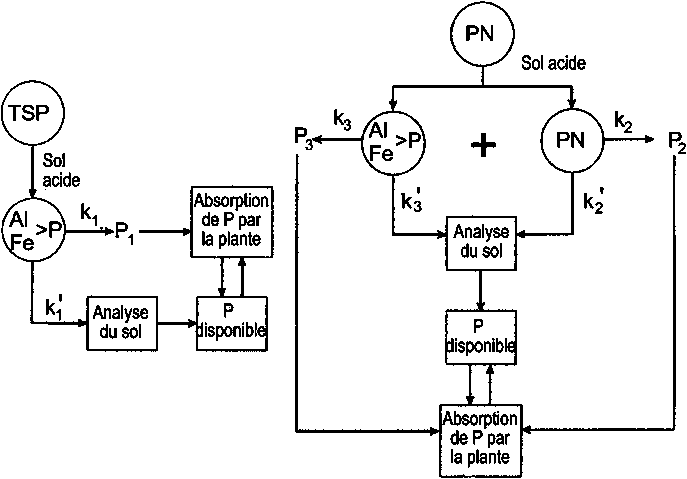 Quand un engrais phosphaté hydrosoluble, par exemple du TSP, est appliqué dans un sol acide contenant des oxydes de fer (Fe) et d'aluminium (Al), les produits de réaction sous forme de P-Fe-Al sont les sources de phosphore disponible pour l'absorption par la plante grâce aux processus de désorption/ dissolution (figure 14). Si la quantité de phosphore disponible extraite par un type d'analyse de sol (k1') est proportionnelle (c'est à dire a une bonne corrélation) à la quantité de phosphore absorbée par la plante (k1) ou à la production de la culture, alors ce type d'analyse de sol convient pour effectuer des recommandations de doses d'engrais phosphaté hydrosoluble.