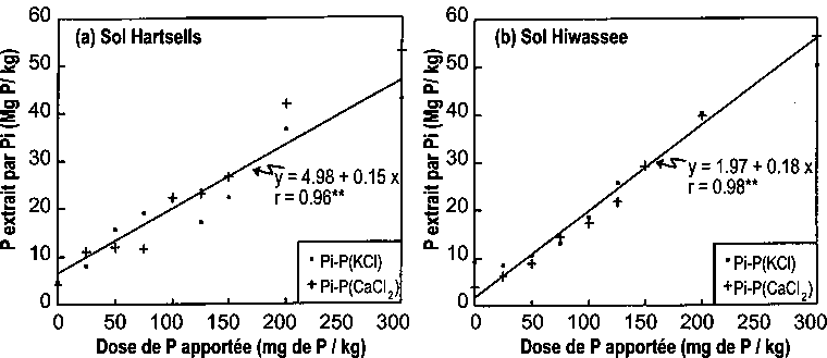 Dans l'étude de Rajan et al. (1991b), la pente de la courbe d'étalonnage pour le PN était très forte en raison des quantités de phosphore extraites par la méthode Olsen (figure 18 a) qui représentaient seulement le phosphore disponible à partir des produits de réaction du PN mais pas du PN non dissous. Pour avoir la même courbe d'étalonnage pour le PN et le TSP, Perrott et al. (1993) ont employé un facteur de correction (1,69) pour multiplier les valeurs de phosphore extrait par la méthode Olsen du PN et déplacer la courbe du PN vers la courbe du TSP (figure 18b). Cependant, cette modification est une approche empirique et dépend de plusieurs facteurs: par exemple le temps de dissolution du PN, la réactivité du PN, les propriétés du sol, et l'espèce cultivée.