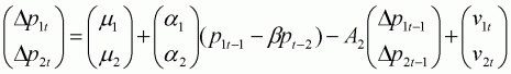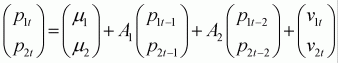 Consider a Vector Autoregression (or VAR) of two variables p1t and p2t. A VAR expresses a vector of variables as a linear sum of a set of lags of itself. A simple case of a VAR between two variables is:
