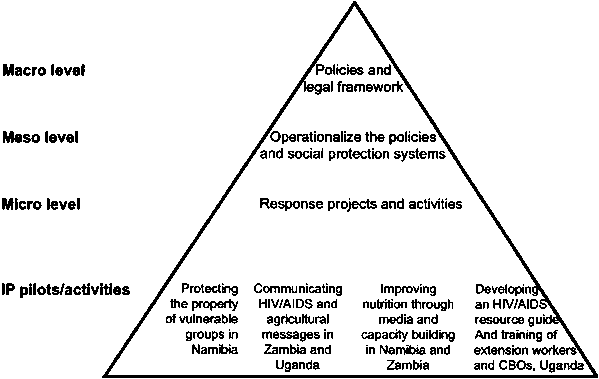 The case studies illustrate the gap between the epidemics impacts on rural peoples lives and the policy responses that take place at the national level, which include agriculture, gender, HIV/AIDS and the legal protection of property. Clearly, more needs to be done to close this gap and foster an enabling policy environment. The challenge is clear. How can countries support increasing numbers of vulnerable households? What can be done to reverse the trend towards increasing destitution? What can be done to maintain the agricultural and rural sectors intact? In order to achieve a holistic and consolidated approach to solving these issues, a comprehensive and collaborative response that effectively mitigates the impacts of the HIV/AIDS epidemic on rural livelihoods needs to be implemented at the macro, meso and micro levels (Figure 11).