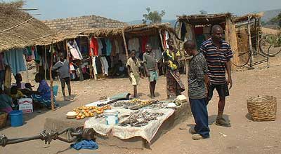 Selling vegetables and dried fish at a market in Northern Zambia