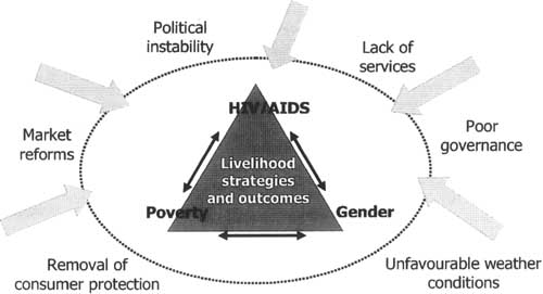 FAO recognizes that HIV/AIDS is interwoven with many other determinants of food insecurity and poverty (Figure 12) (FAO, 2003). The current food-related crisis in Southern Africa, for example, is the culmination of a number of factors including policy mistakes, mismanagement and poor governance, inappropriate market reforms, a lack of extension and other support services for farmers, the removal of consumer protection, and political instability, in addition to unfavourable weather conditions and HIV/AIDS (Morris, 2002). Gender roles and relations influence the course and impact of the HIV/AIDS epidemic. Gender-related factors shape the extent to which men, women, boys and girls are vulnerable to HIV infection, the ways in which AIDS affects them, and the kinds of responses that are feasible in different communities and societies (UNGASS, 2001).