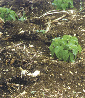 When the base fertilizer has been added during the final stages of soil preparation there is normally no need to apply a nutrient feed immediately after planting. However in areas or seasons of very high rainfall when serious soil nutrient losses from leaching can occur it may be preferable to apply the feed soon after planting. If applying fertilizer after planting it is usual to apply 1 ounce (28 grams) of a general bag fertilizer with an N:P:K ratio of 11:22:22. This should be sprinkled around each plant but taking care not to get any on the plant's leaves otherwise they may become scorched and then become prone to disease. If conditions are dry this fertilizer application should be watered in, but care must be take not to let it be washed off into the gullies.