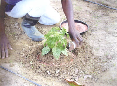 The main fertilizers applied to the growing crop are nitrogen, phosphorus and potassium. There may also be occasions when another nutrient is required, due to a deficiency of an essential nutrient. However, advice from an extension officer should be sought before attempting to remedy a suspected nutrient deficiency. In fact advice should sought from extension or advisory officers whenever in doubt about any aspect of crop nutrition; in this way a better understanding will be gained by the farmer.