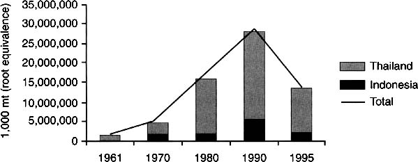 The importer side of the picture is slightly more diverse. In 1995, 22 countries imported more than 10 000 tonnes of cassava (root equivalent) (Table 45). The data in this table are a little misleading. For example, the 1995 Indonesia import of cassava is an aberration. Also Australia, Bangladesh, Argentina and Mozambique have not been traditional importers of cassava. Finally Japan and the United States have imported substantially more in 1995 than what is indicated in Table 45. Nevertheless, the table is instructive. It illustrates that the demand side of cassava markets are more variable than the supply side. Depending on a country's risk preference, they may see the export market as an opportunity or a risk.