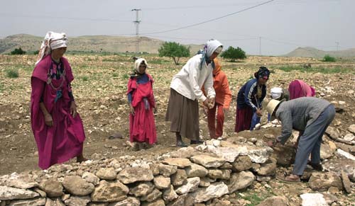 Des participants au programme construisent un cordon en pierres pour intercepter les eaux de ruissellement et les faire pénétrer dans le sol afin quelles ne se perdent pas.