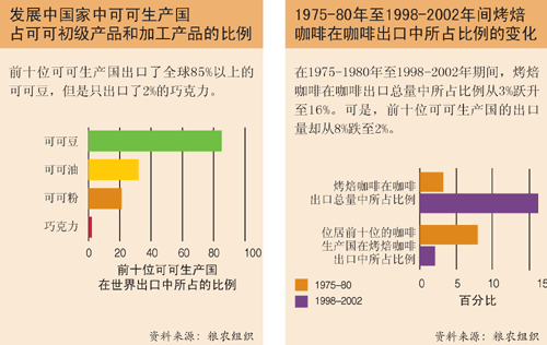 发展中国家加工农产品出口份额的下降,在可可和咖啡这类产品上尤其明显。随着加工阶段的发展,位列世界出口前十位的可可生产发展中国家的出口份额呈下降趋势。可可贸易总额中巧克力出口的比例从1975-80年间的22%提高至1998-2002年间的58%,而同一时期这些国家的巧克力出口份额从2.4%下降到2%。