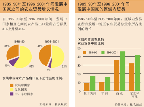 自二十世纪八十年代中期以来,发展中国家之间的农产品贸易以每年8 .8 % 的速度迅速增长, 超过了向发达国家出口4.2%的增长。发展中国家之间的农产品出口比例的增长超过三分之一,从31%提高到44%。