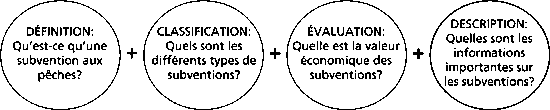 En tant que tel, le Guide propose non pas une définition rigide des subventions, mais plutôt un cadre permettant de les définir; il étudie et suggère des définitions des différents types de subventions. Il ne prend aucunement position sur le point de savoir si une subvention est «bonne» ou «mauvaise»: elles peuvent accroître ou diminuer les revenus et les coûts de l'industrie de la pêche, mais l'analyse du lien entre ce type d'incidence sur les profits et l'effet final sur les ressources et le commerce ne rentre pas dans le cadre du Guide. Par conséquent, cet ouvrage ne porte pas sur l'analyse des effets des subventions sur les ressources, les pêches et le commerce, mais s'emploie à faciliter la collecte et l'organisation des données de telles études. Cela inclut la définition, la classification et la quantification des subventions aux pêches, ainsi que l'étude des mécanismes de leur attribution.