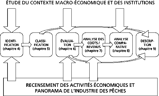 Les études sur les subventions aux pêches peuvent s'attacher à des objectifs différents et se rapporter à des domaines variés; dès lors, elles ne comprennent pas toujours les mêmes éléments constitutifs. Dans le présent Guide nous avons examiné les plus importantes. Il importe naturellement à l'utilisateur du Guide de décider quelle partie du document se rapporte le mieux à son étude particulière. La figure 10 récapitule les différents éléments présentés dans le Guide et souligne l'importance de la collecte des informations tant auprès du secteur public que de l'industrie des pêches.
