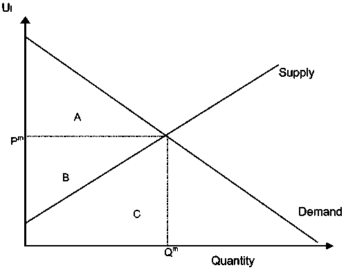 The area under the supply and demand curves indicates the aggregate supply and demand respectively for a good or service. In a competitive, freely functioning market, a quantity Qm of the good or service is traded at the market price Pm, which is the price at which demand matches supply. If quantities less than Qm are traded, consumers are willing to pay more than the market price (the demand curve is higher than Pm), suggesting that market price alone is only a minimum estimate of the economic value or benefit derived. The area between the market price and the demand curve (triangle A) is the consumer surplus, or the additional utility gained by consumers above the price paid. Therefore, total social benefits or TEV are the expenditure (areas B + C, or price multiplied by quantity) plus the consumer surplus (area A). The total cost of producing quantity Qm is the area below the supply curve (area C). The area above the supply curve and below the market price the producer surplus; this occurs because producers are willing to sell for less than the market price if the quantity traded is less than Qm (the supply curve is less than Pm). The net social benefit is the consumer surplus (area A) plus the producer surplus (area B).