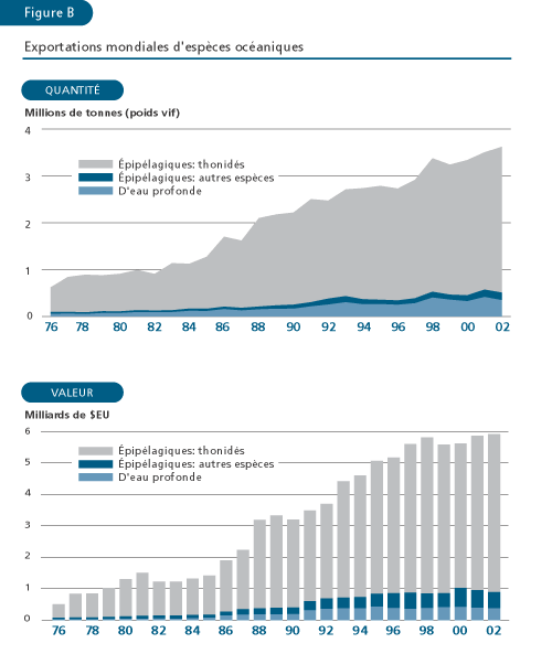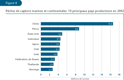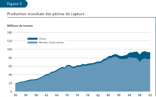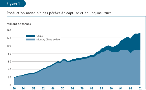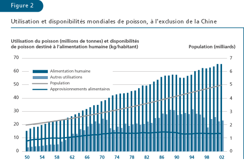 La production mondiale des pêches de capture et de l’aquaculture a fourni en 2002 environ 101 millions de tonnes de poisson destiné à l’alimentation: l’offre par habitant serait donc de 16,2 kg (équivalent poids vif) – cette croissance de la disponibilité par habitant depuis 2000 étant le fait de l’aquaculture (tableaux 1 et 2, figures 1 et 2). En dehors de la Chine, le rythme de la croissance démographique a été plus rapide que le taux de progression de l’offre totale de poisson destiné à l’alimentation; la disponibilité moyenne de poisson par habitant a donc baissé, tombant de 14,6 kg en 1987 à 13,2 kg en 1992 et est restée stable (figure 2). Dans l’ensemble, le poisson a assuré à plus de 2,6 milliards de personnes au moins 20 pour cent de leur apport de protéines animales. La part des protéines fourni par le poisson dans le total mondial de la fourniture de protéines animales a augmenté, passant de 14,9 pour cent en 1992 au chiffre record de 16,0 pour cent en 1996 et s’est stabilisée à ce niveau en 2001 (15,9 pour cent).