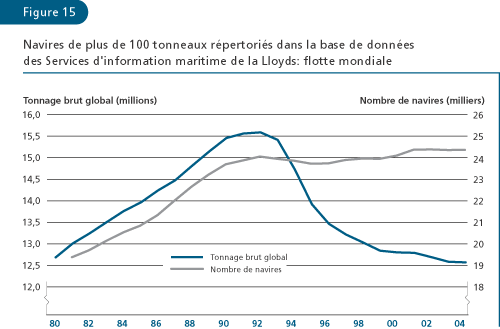 La jauge brute globale des grands navires de pêche dans les eaux marines (définis comme ayant plus de 100 tonneaux de jauge brute) a atteint le chiffre record 15,6 millions en 1992 (24 074 navires) et a baissé depuis lors7. Cependant, le nombre de ces navires a peu à peu augmenté jusqu’en 2001 et s’est relativement stabilisé ces dernières années aux alentours de 24 000 unités (figure 15). En 2002, la flotte des grands navires a légèrement progressé pour atteindre 24 406 unités et a fluctué autour de ce chiffre jusqu’en 2004; toutefois, depuis 1992, sa jauge totale s’est contractée à la suite de l’adoption par de nombreux pays de programmes visant à limiter les capacités. En 2003, la Fédération de Russie avait la plus grande capacité mesurée en jauge brute (24 pour cent du total des tonneaux bruts), suivie du Japon et des États-Unis d’Amérique (7 pour cent chacun), de l’Espagne (6 pour cent), de la Norvège (3,5 percent) et de l’Ukraine (3 pour cent). Deux pays de libre immatriculation, le Panama et le Belize, comptaient pour 6 pour cent de la jauge brute mondiale dont 4,4 pour cent étaient attribuables à des navires battant pavillon inconnu.