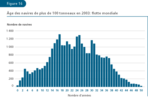 L’âge moyen de la catégorie des grands navires de pêche qui opèrent dans les eaux marines a continué à augmenter au niveau mondial. En 1992, environ 30 pour cent de ces navires avaient moins de 10 ans et 6 pour cent avaient plus de 30 ans, alors qu’en 2003, ces pourcentages étaient respectivement de 13 pour cent et de 28 pour cent; la figure 16 montre le profil d’âge de la flotte mondiale en 2003. Parmi les flottes nationales qui ont plus de 200 000 tonneaux bruts, la flotte japonaise est la plus jeune (âge moyen de 16 ans), tandis que celle de la République de Corée est la plus vieille (âge moyen de 29 ans). La France et Vanuatu ont des flottes relativement jeunes (respectivement, 19 ans et huit ans en moyenne), alors que les flottes de l’Afrique du Sud, du Ghana, des Philippines et du Sénégal ont généralement toutes plus de 30 ans.