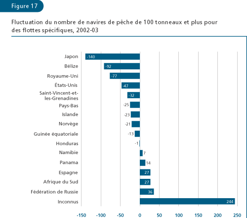 En 2003, il apparaît que plusieurs des principaux pays qui pratiquent la pêche ont beaucoup réduit le nombre de leurs navires de 100 tonneaux et plus, mais par le biais d’un transfert de pavillon (figure 17). Le Japon se classe en tête de ces pays, avec une diminution totale de 140 navires. Les États-Unis, l’Islande la Norvège et les Pays-Bas ont tous transféré plus de navires sous un autre pavillon qu’ils n’en ont immatriculé. On note une forte contraction de la flotte du Royaume-Uni qui a envoyé des vieux navires à la casse et qui a transféré le pavillon de certaines de ses unités. En revanche, l’Espagne a beaucoup augmenté sa flotte en construisant de nouveaux navires. Les navires qui ont changé de pavillon et qui figurent désormais dans la catégorie «pavillon inconnu» représentent plus de 25 pour cent des transferts de pavillon. Sur le registre de la Lloyd’s figurent 1 213 navires de plus de 100 tonneaux bruts battant «pavillon inconnu» et considérés comme poursuivant encore leurs opérations en 2003 (compte non tenu des données antérieures à 1970). Sur les navires pour lesquels on dispose de renseignements concernant leur pavillon antérieur, 51 pour cent étaient immatriculés dans l’un des pays suivants: Belize,Guinée équatoriale, Honduras, Panama, Saint-Vincent-et-les Grenadines, Vanuatu, et 56 pour cent de ces unités avaient été construites soit au Japon soit à Taiwan Province de Chine.
