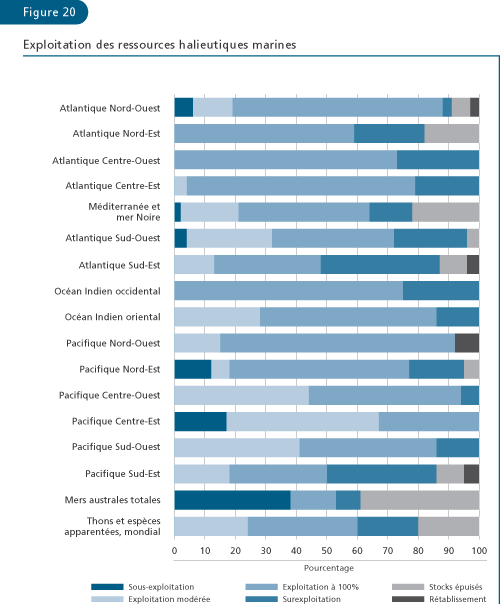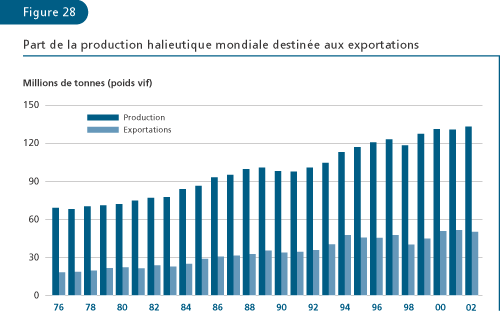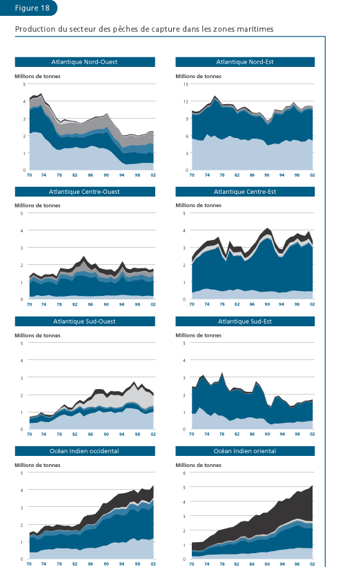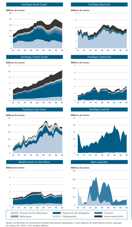 Après une augmentation qui l’a portée de 79 millions de tonnes environ en 1998 à 87 millions de tonnes en 2000, la production mondiale de pêches de capture en mer a régressé, pour s’établir à près de 84 millions de tonnes en 2001 et se maintenir à ce niveau en 2002. Le recul d’environ 2,5 pour cent du volume mondial des prises s’explique principalement par le déclin, de 12 pour cent et 7 pour cent respectivement, des prises dans le Pacifique Sud-Est et le Pacifique Nord-Ouest.